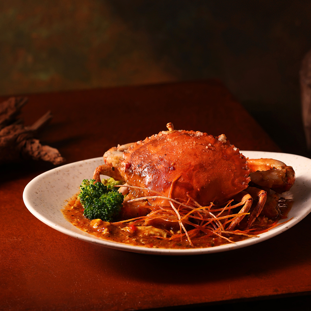 紅蟳鮮殼映照秋日紅霞,飽滿蟹肉浸潤辛香醬汁,佐以芋頭糕的軟糯綿密。米酒與蝦油的醇厚,伴隨香料的熱烈氣息,如海風般席捲而來,層層堆疊的滋味,彷若秋夜裡最濃烈的樂章。