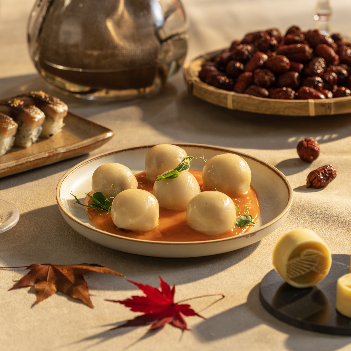 玲瓏晶瑩的外衣,盛裝著柿餅的甘潤、栗子與芋頭的香糯、鮮蚵與蝦仁的鮮美。輕輕一口,餡香四溢,恰似大地的豐饒盡藏其中。宛如秋日果實般的吉兆,晶亮如詩,吟頌著豐收的喜悅。