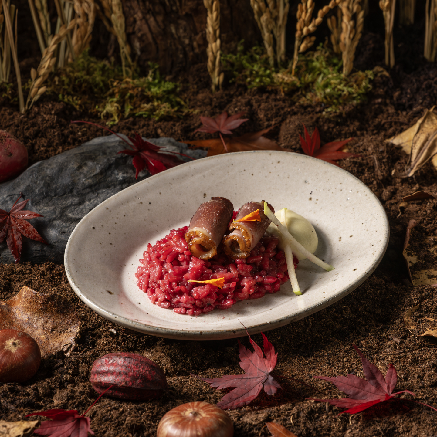 鴨胸以杜松子與鹽花醃漬,煎香後舒肥,鎖住肉質鮮嫩。蘋果的酸甜輕盈點亮鴨肉的濃郁,層次分明。選用花蓮26號燉飯米,口感比義大利米更飽滿Q彈;搭配甜菜根與藍紋布里起士醬,勾勒出秋日的優雅濃彩。