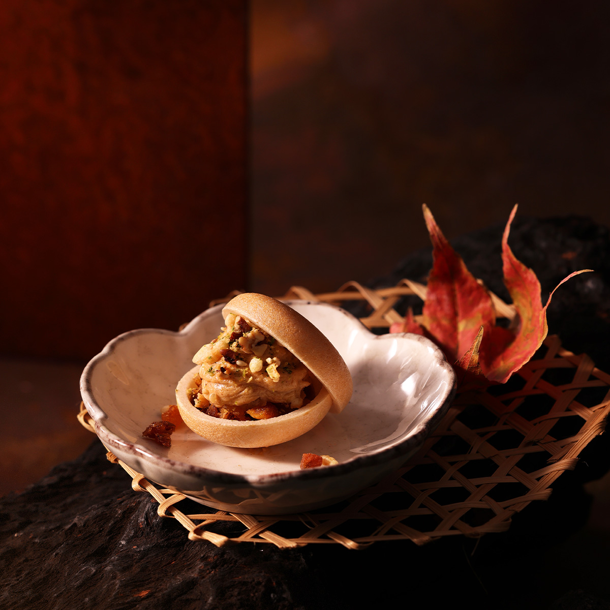 最中餅皮清脆輕薄,內裹柿餅、米香、堅果與烏魚子,層次豐富。當奶油起司、抹茶及花生粉在口中滑順流淌,果香與鹹香相互交織,驚喜感宛如秋日裡的一抹斜陽。