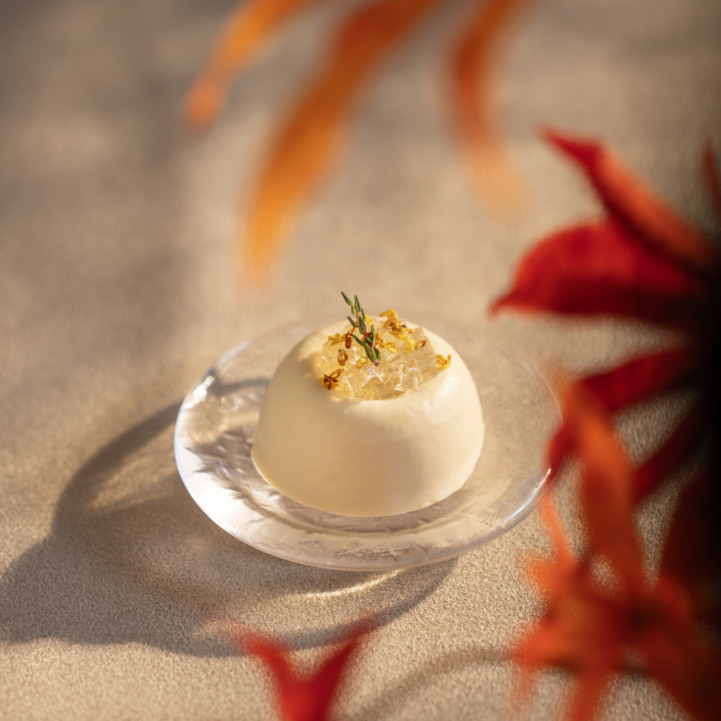 以冰糖水梨銀耳羹為靈感,細膩轉化為清新慕斯。甘露梨與桂花的甘潤幽香交織,入口綿滑而雅緻,帶來秋日的柔和。